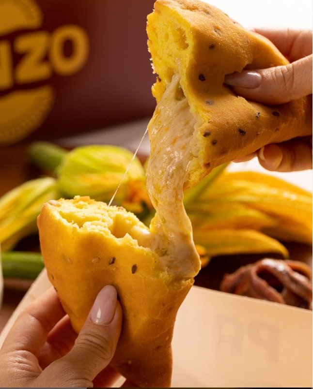 Un tripudio di sapori mediterranei vi aspetta in questo panzerotto unico. Mozzarella, fiori di zucca freschi, olio extra vergine di oliva, alici sott’olio e un tocco di peperoncino per una combinazione di gusto che vi porterà direttamente in Puglia.