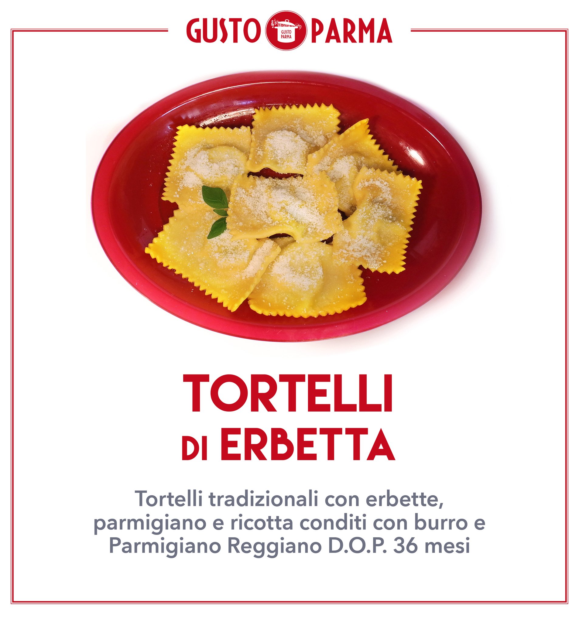 Pasta ripiena di bietole e/o spinaci con ricotta, “annegati” nel burro aromatizzato alla salvia e “asciugati” da buon Parmigiano Reggiano DOP 36 mesi o come si dice in dialetto parmigiano “foghè in t’al butér, sughè in t’al formài“ (affogati nel burro, asciugati nel formaggio, ovviamente parmigiano reggiano).